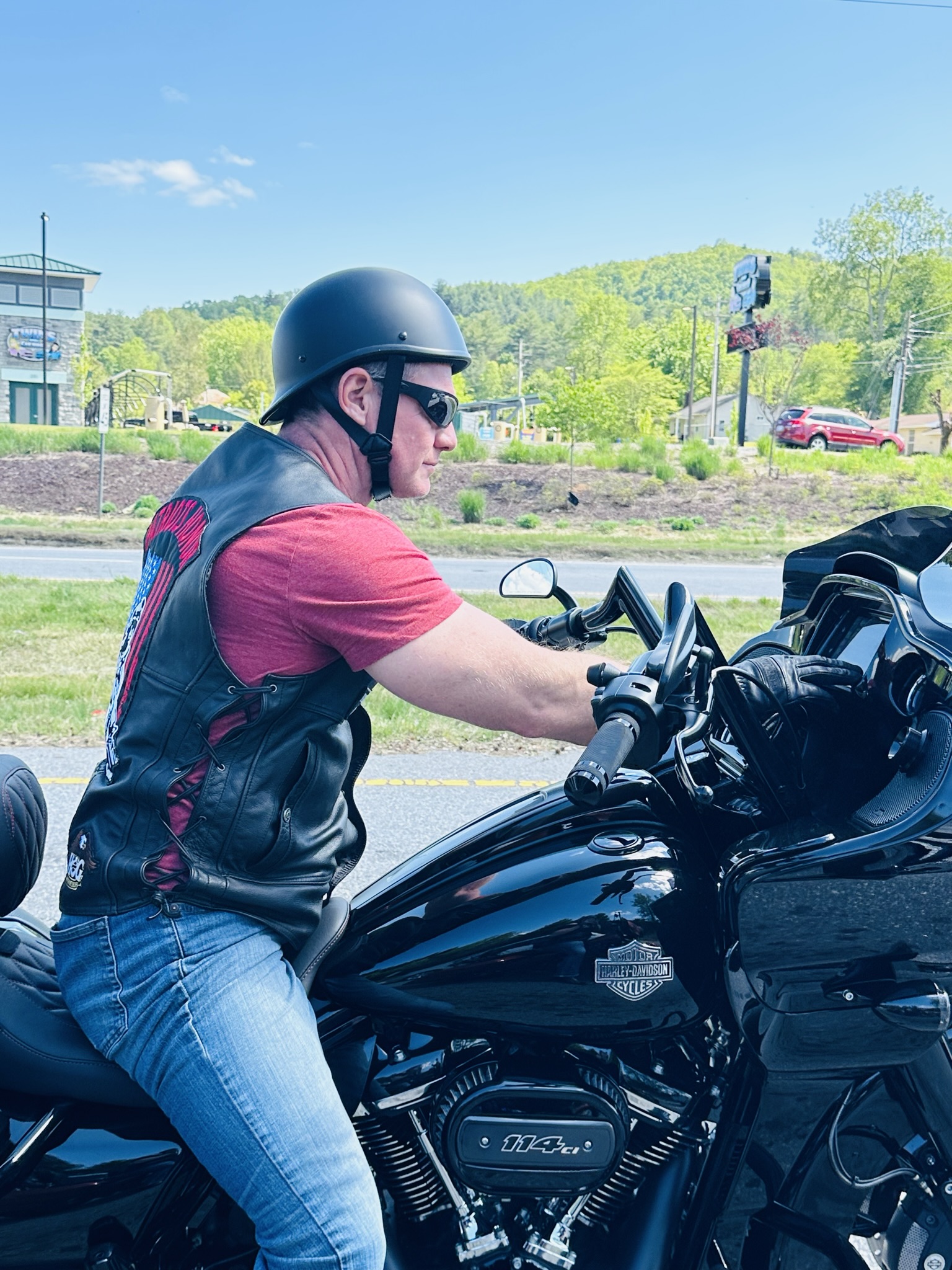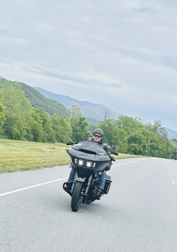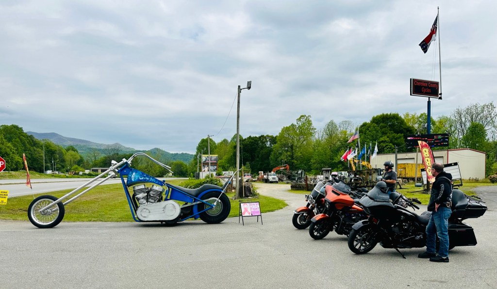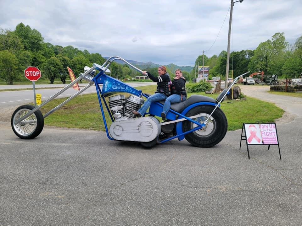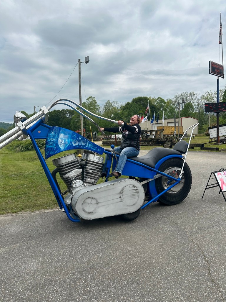 It is the “World’s Largest Rideable Chopper Motorcycle” in front of Cherokee County Cycles just outside Andrews, NC. The BIG MOTORBIKE and Virginia is now My Biatch!! I was screaming in the 360 Video because I thought that we were going to tip over getting on this big ass bike!